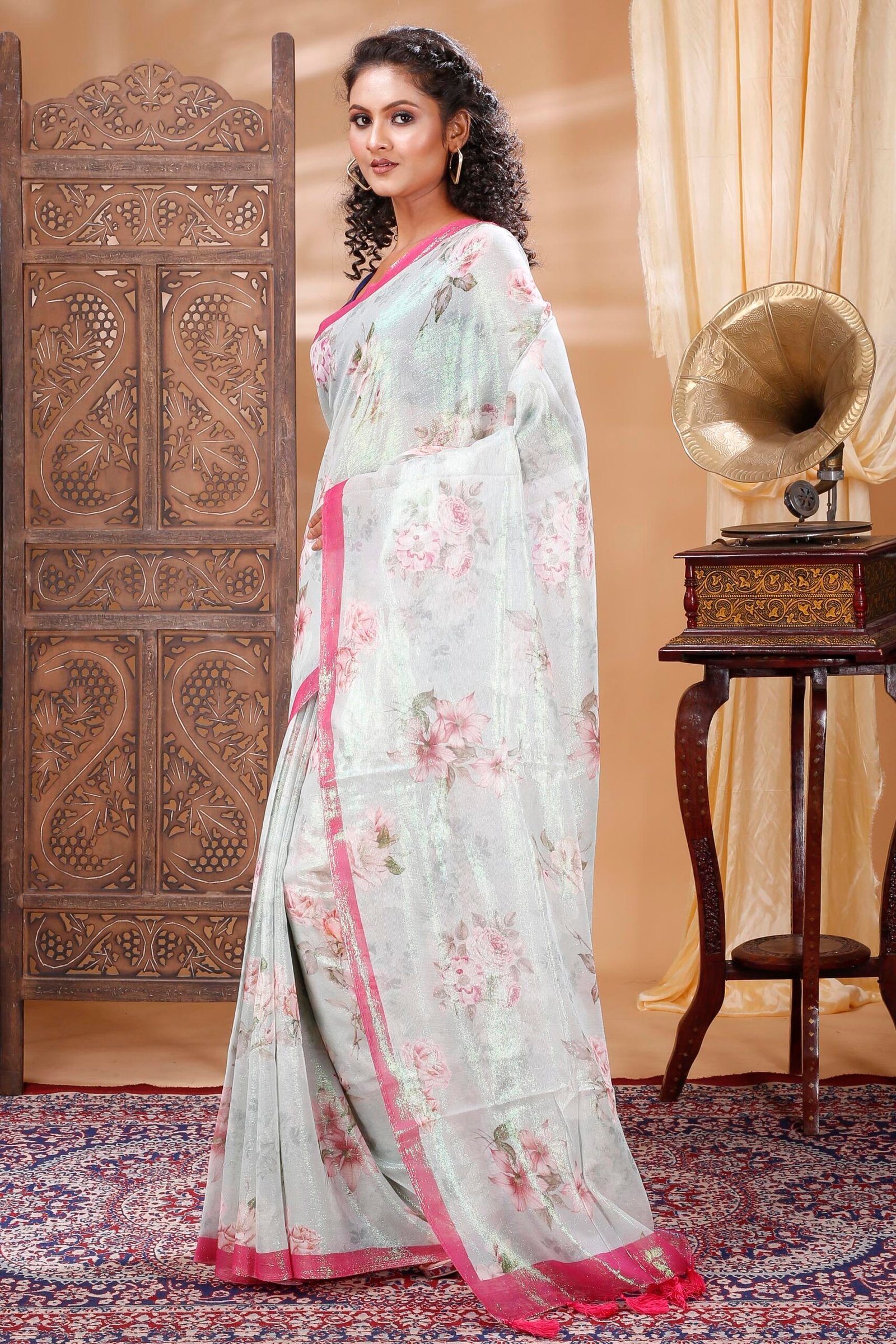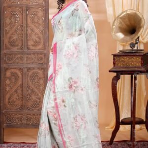 ✨ White & Pink Floral Linen Saree – Description