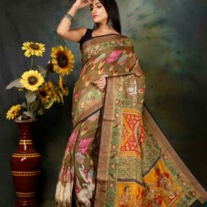 Premium Quality Linen Saree with Kalamkari Prints — A higher-end linen saree with rich prints; if you want something more refined, this gives a blend of comfort and luxe.
