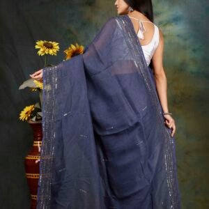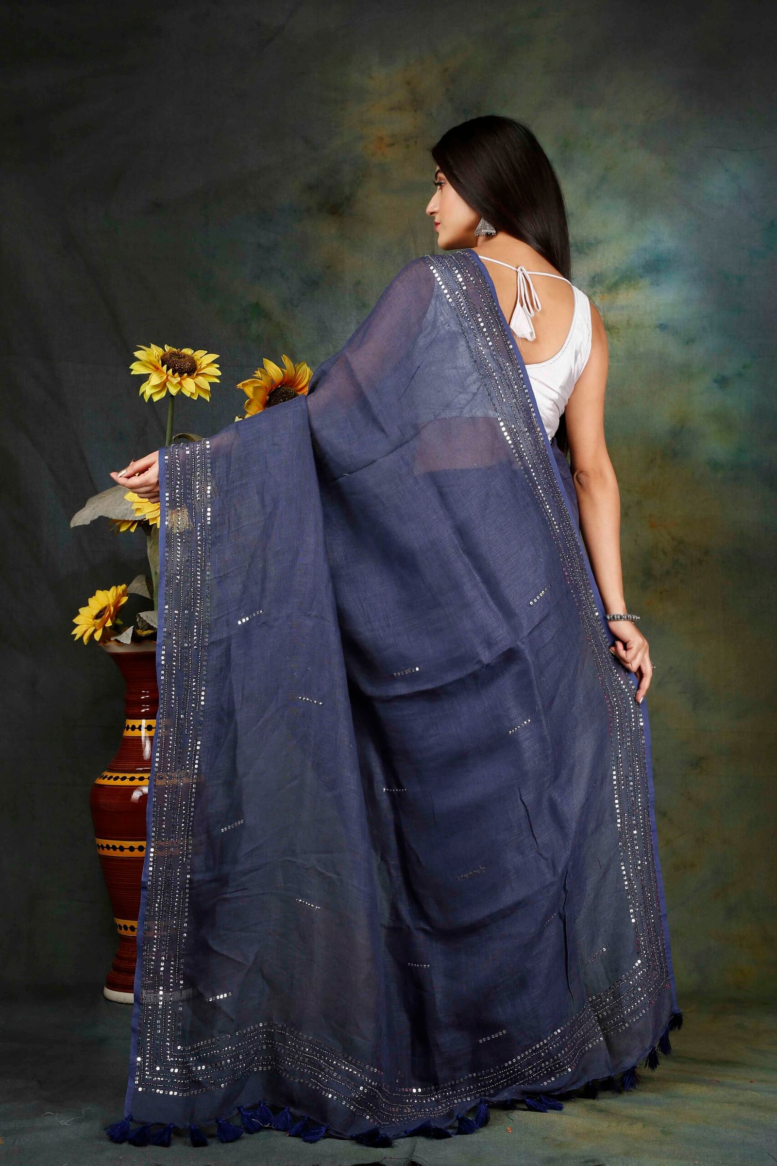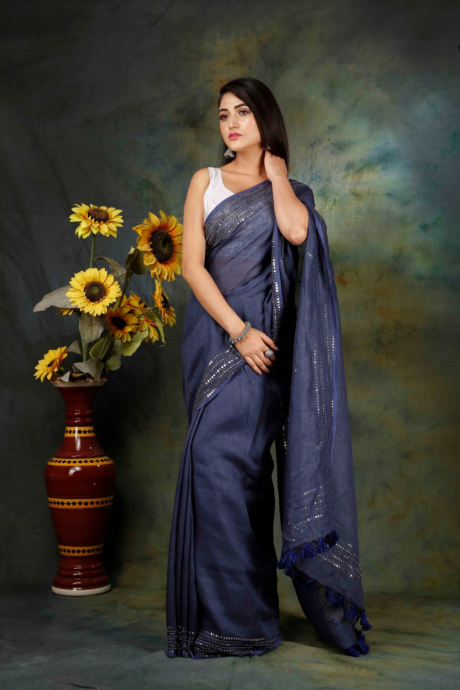 Celebrate artistry and effortless grace with this hand-embroidered linen saree, a piece that beautifully blends traditional craftsmanship with modern simplicity.