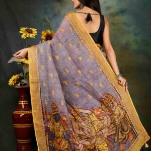 Tussar silk sarees often feature traditional designs like hand block prints, Kalamkari motifs, floral patterns, temple borders, and intricate zari work. Many pieces are handwoven, reflecting the skill of Indian artisans. The natural texture of the fabric blends beautifully with rich colors such as maroon, mustard, teal, royal blue, and earthy browns.